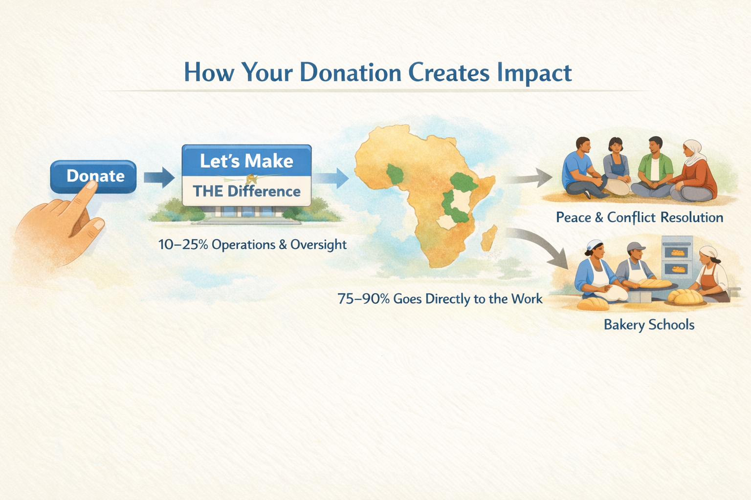 They start with self-development and transformational leadership education. Then they are eligible to learn to lead peace and conflict-resolution training. We also offer entrepreneurial programs, as our goal is to build local refugee-owned bakeries and other businesses, so previously marginalized communities learn to solve problems, spread peace, earn income, build their economy, and create stability for themselves, reducing the stress on their host countries.”